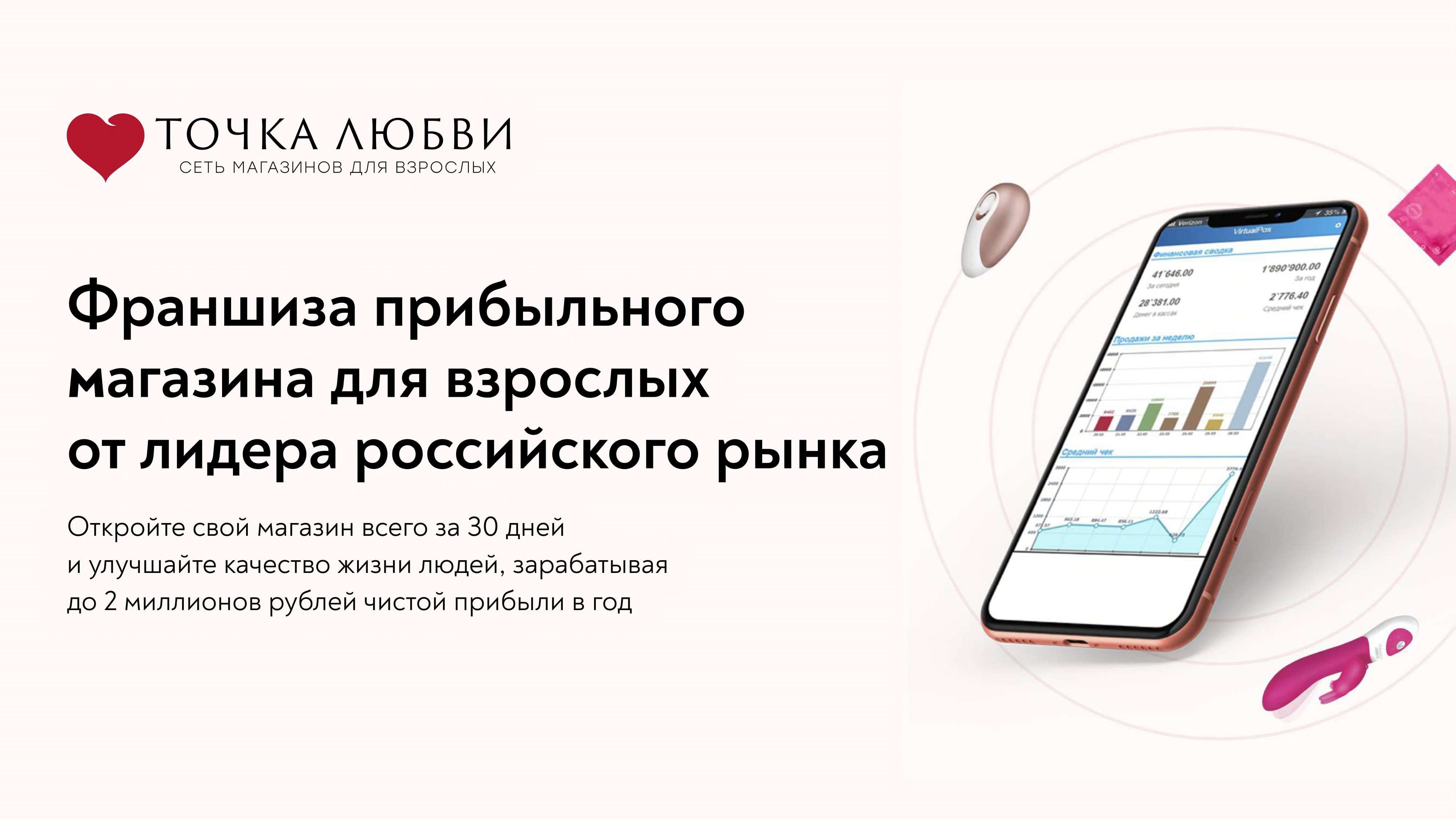 Компания «Точка Любви» — лидер российского рынка интим-товаров. Они предлагают стать их партнёром и открыть собственный секс-шоп в любом городе России с населением от 300 тыс. человек. Это позволит зарабатывать до 2 млн руб. в год, одновременно с этим повышая уровень сексуального образования и улучшая качество интимной жизни людей.