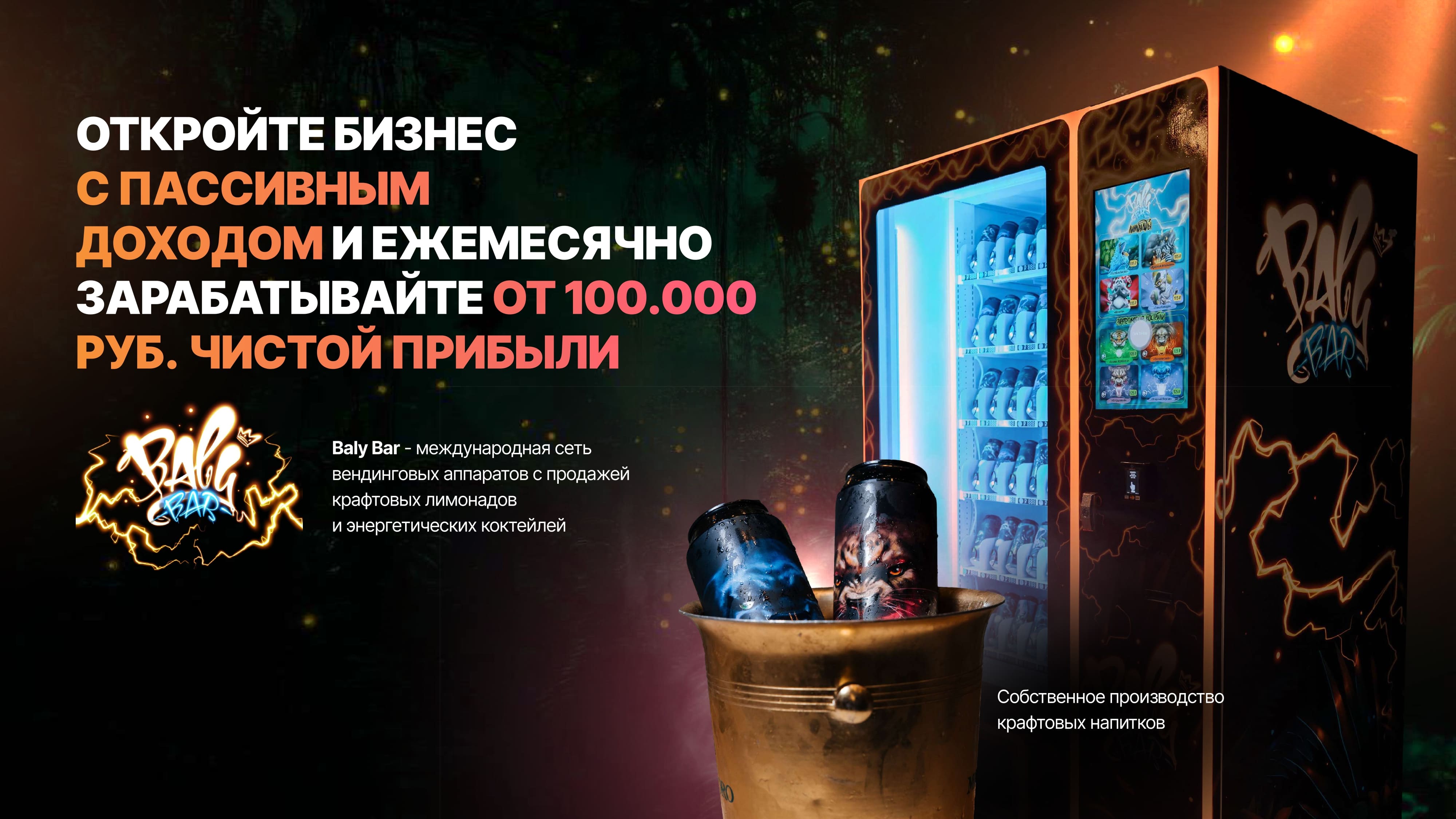 Франшиза Baly Bar – это возможность установить вендинговый автомат с авторскими безалкогольными энергетиками и коктейлями и зарабатывать от 700 000 рублей чистой прибыли в год с одной точки.